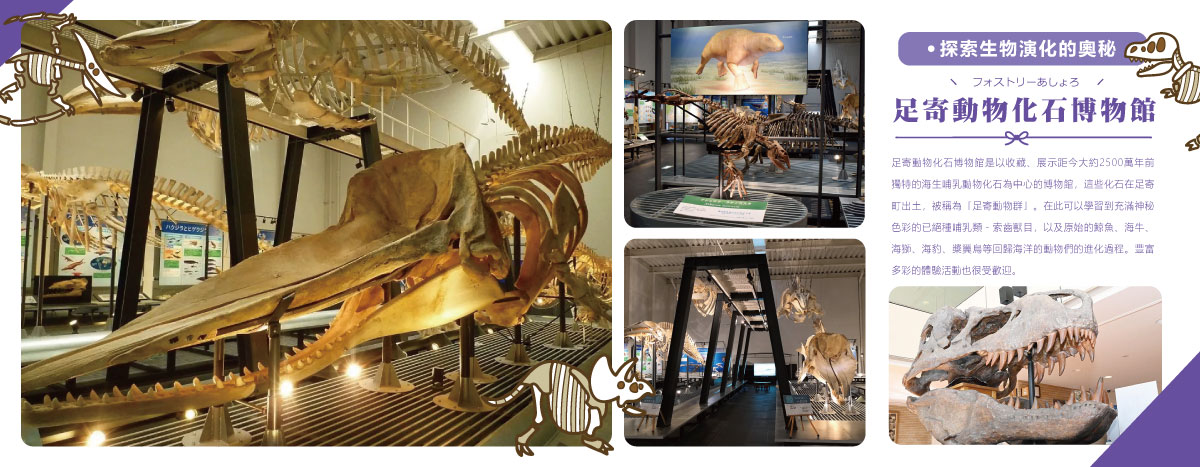 展示距今約2500萬年前,在足寄町出土的獨特海洋哺乳動物化石(足寄動物群)的專門博物館,以索齒獸化石為主,同時展出原始鯨魚、海牛、海獅、槳翼鳥等已滅絕生物的進化過程,並提供化石製作體驗活動,是學習古生物學、激發兒童興趣的絕佳場所。