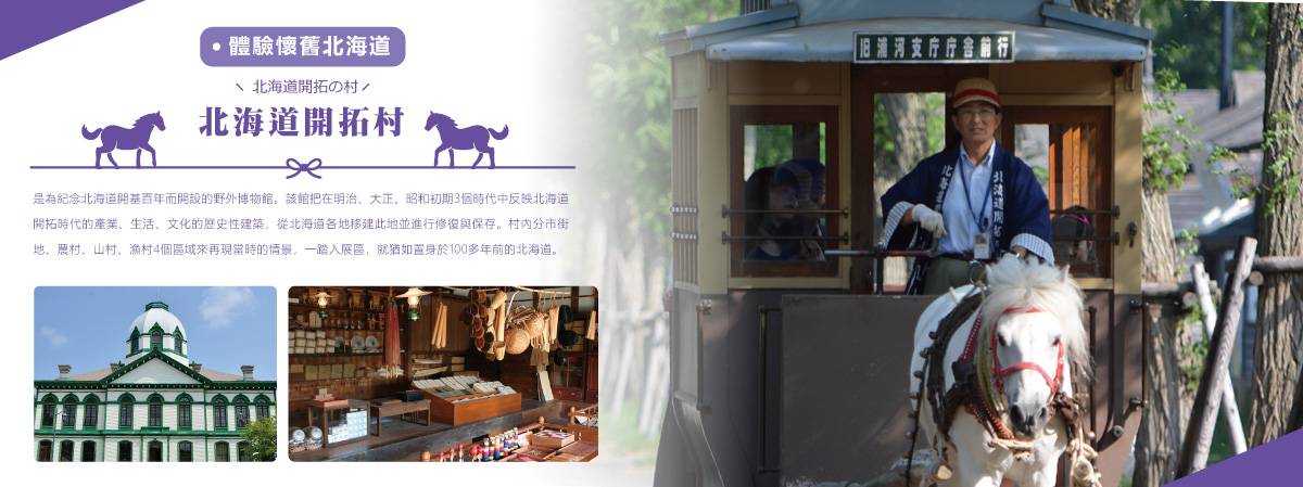 是為紀念北海道開基百年而開設的野外博物館。 該館把在明治、大正、昭和初期3個時代中反映北海道開拓時代的產業、生活、文化的歷史性建築,從北海道各地移建此地並進行修復與保存。 村內分市街地、農村、山村、漁村4個區域來再現當時的情景,一踏入展區,就猶如置身於100多年前的北海道。