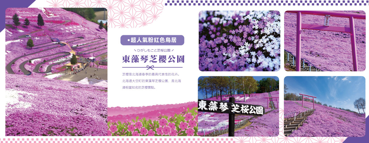 北海道大空町的知名景點,每年5月上旬至6月上旬會舉辦「東藻琴芝櫻祭」,以10公頃廣闊山坡上盛開的粉紅、白色及紅色芝櫻聞名,形成如粉紅地毯般的壯麗景觀,園區內有山津見神社、粉紅鳥居等特色地標,是體驗北海道春季花海的必訪之地。