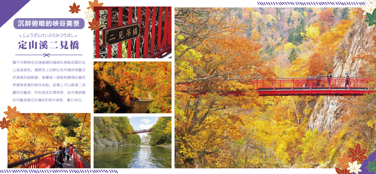 北海道札幌定山溪溫泉區的標誌性景點,以其鮮紅色吊橋、周圍的「二見岩」、河童傳說的發源地「河童淵」聞名,秋季(10月上中旬)時,楓葉紅黃交織,與溪谷和吊橋構成絕美景色,遊客可沿著二見定山之道散步,享受森林浴與壯麗的紅葉溪谷風光,是體驗定山溪秋季魅力的必訪之地。