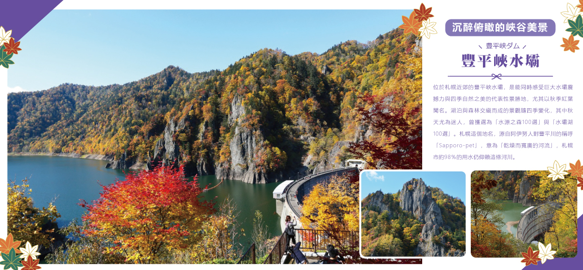 札幌近郊頂級賞楓名所,每年10月上旬至中下旬,峽谷被金黃、橙紅的楓葉染遍,與湛藍的定山湖及雄偉大壩形成「水壩紅葉」絕景,最佳觀賞點包括水壩展望台、九段瀑布與步道,需搭乘環保電動巴士前往,結合自然美景與工程奇觀。