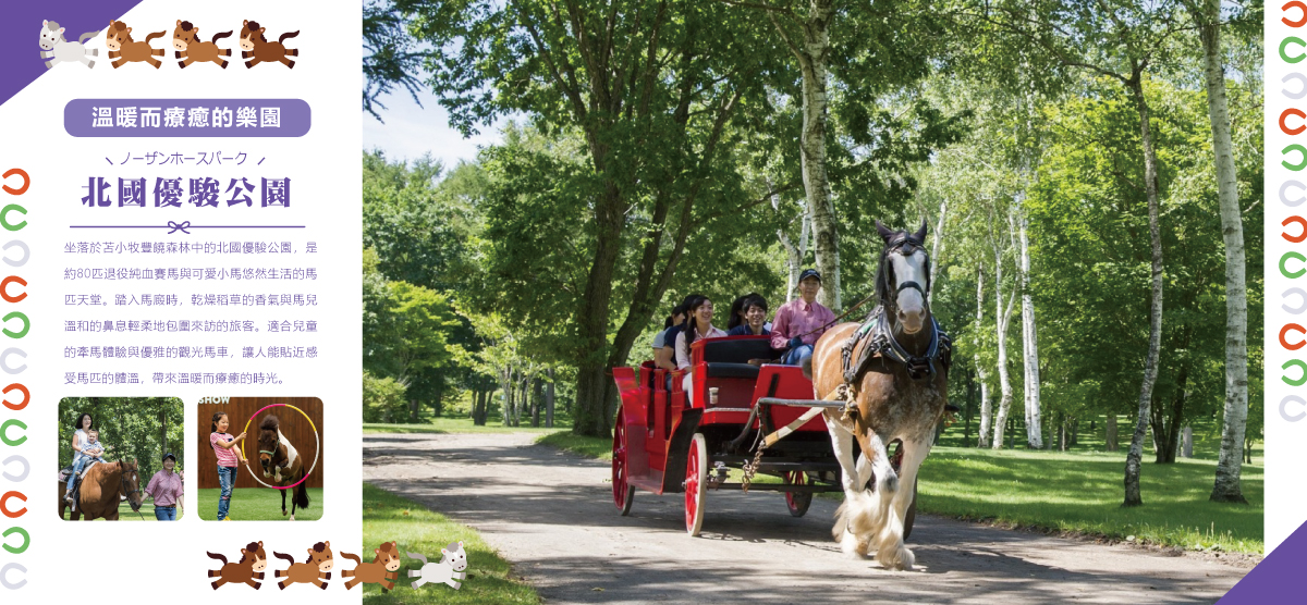 以退役賽馬和迷你馬為特色,並提供騎馬、觀光馬車等與馬親密互動的體驗(旅客可自費體驗),並有四季不同的戶外活動,還有美食和療癒的植物園,適合全家大小同樂。