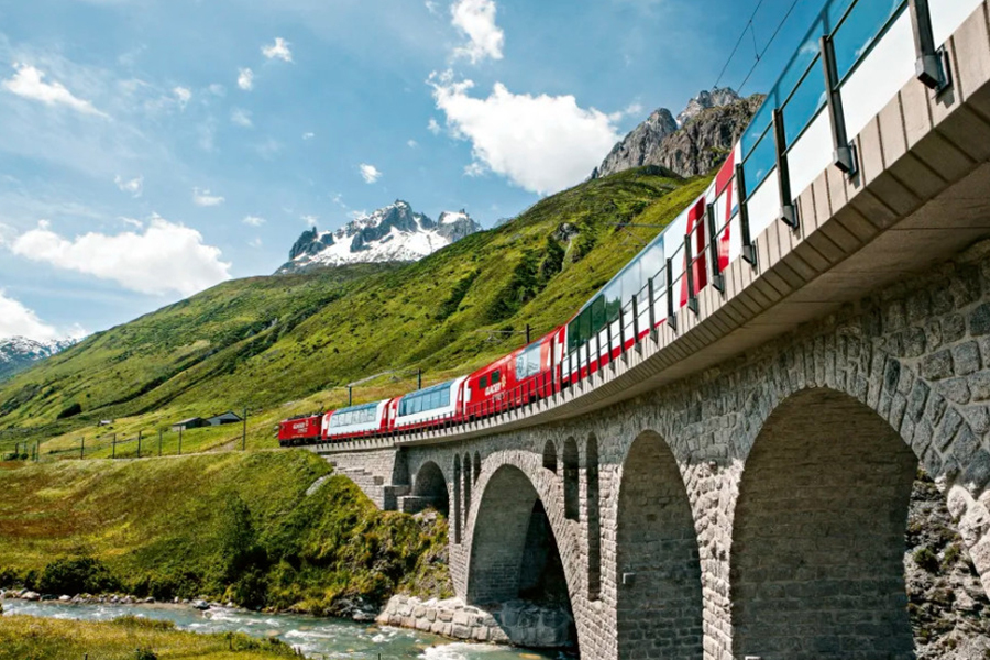瑞士國鐵列車,行駛冰河景觀路面,將帶領遊客體驗全方位的感受之旅。悠然地從令人眼花缭亂的聖莫裏茨駛往同樣精致迷人的策馬特,遊客不僅能夠欣賞到美麗的風景,還能感受最先進的技術成就。
